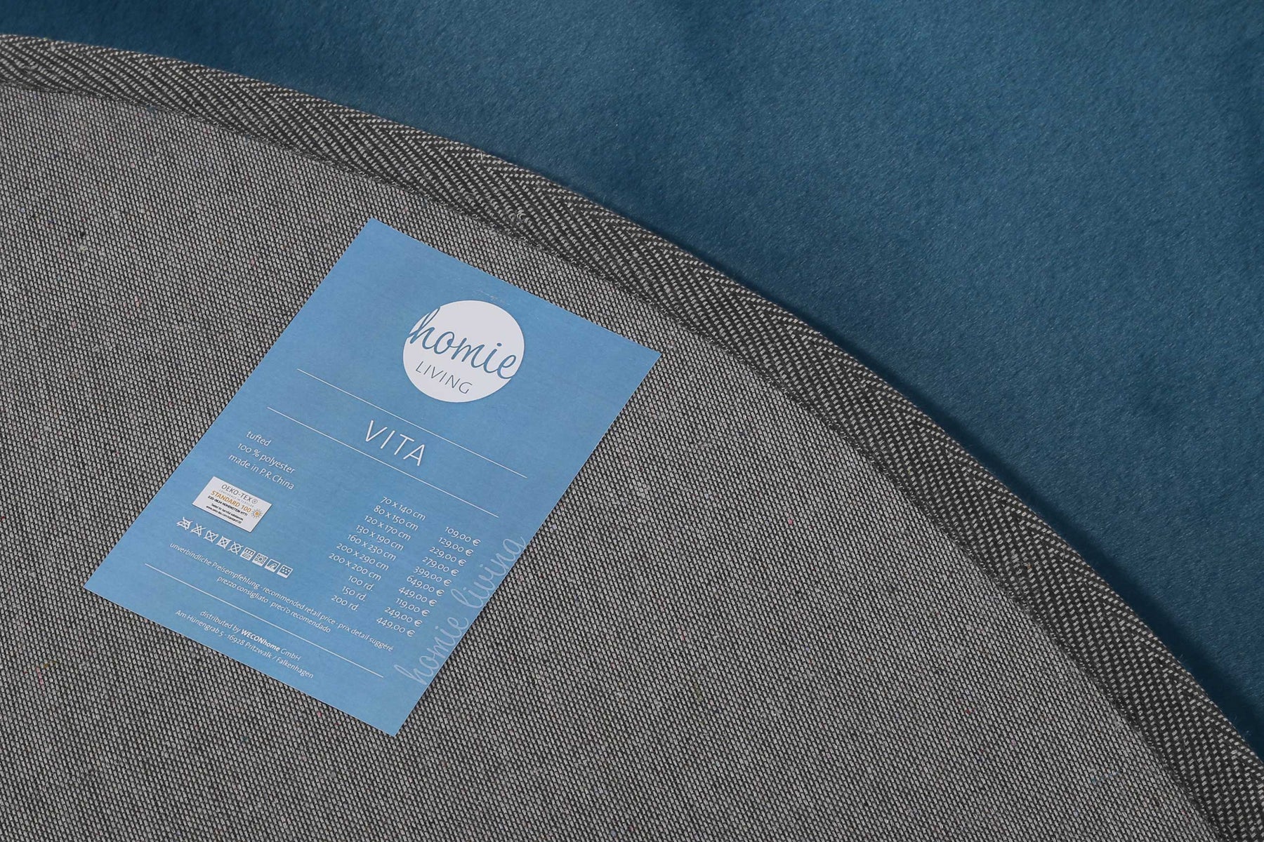 Une fois qu'on l'a touché, on ne peut plus lâcher ce tapis rond bleu pétrole VITA de la série Homie Living. C'est promis ! Que ce soit au salon, dans la chambre des enfants ou votre chambre à coucher, le tapis VITA apporte un confort incroyablement douillet et vous faîtes le choix parfait. Résistant et non pelucheux, il est bien sûr certifié STANDARD 100 by OEKO-TEX.