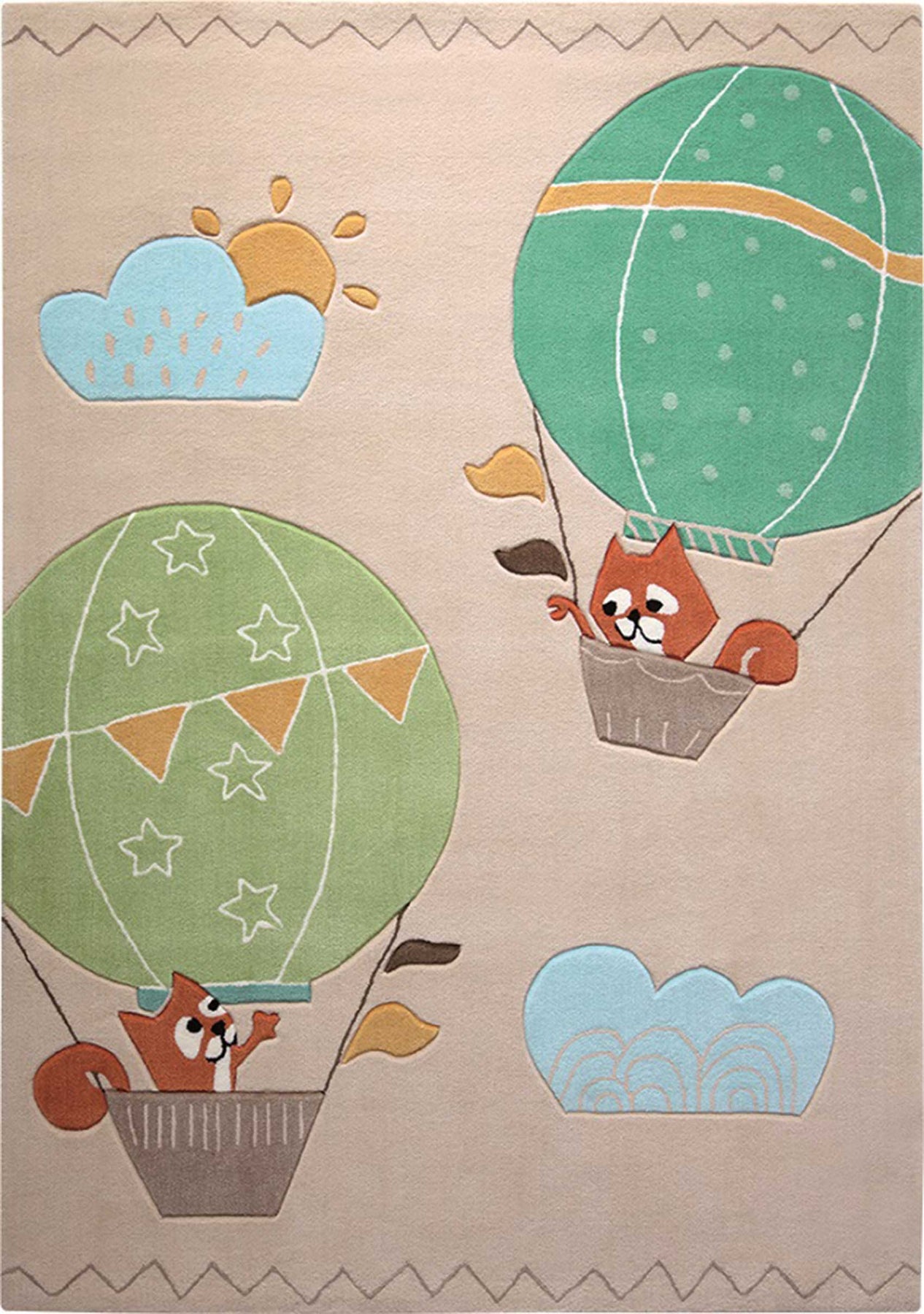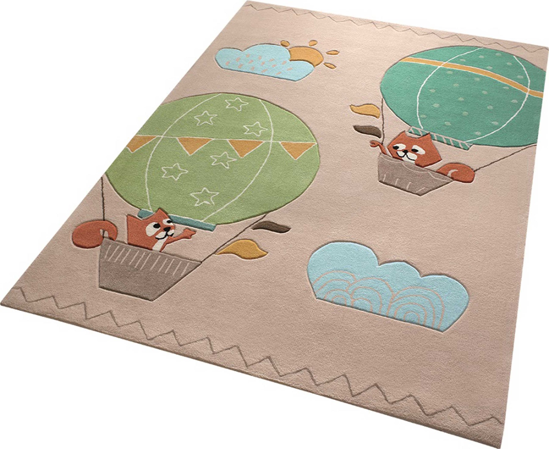 Simplement magnifique ! Avec les petits renards, les enfants peuvent partir en montgolfière et voir le monde d'en haut. Et est-ce que le soleil ne brille pas derrière les nuages ? Ce tapis pour enfants ravit non seulement les petits aventuriers, mais grâce à sa fabrication de haute qualité et à son matériau résistant, il rend également les parents complètement heureux. Bien sûr, certifié STANDARD 100 par OEKO-TEX.